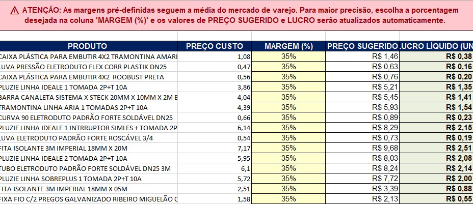 Quero Aprender Tudo IssoTodas as nossas planilhas são totalmente editáveis e de acesso vitalício, com preço de custo, margem de lucro ajustável, cálculo automático de lucro líquido e preço sugerido. ⚠️ ATENÇÃO: As margens pré-definidas seguem a média do mercado varejista. Para maior precisão, basta definir a porcentagem desejada na coluna “MARGEM (%)” que os valores de PREÇO SUGERIDO e LUCRO serão atualizados automaticamente.
